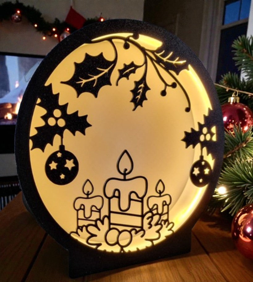 Αυτή η επιτραπέζια χριστουγεννιάτικη λάμπα αποτυπώνει τη διαχρονική μαγεία των κεριών μέσα σε έναν κομψό, κυκλικό σχεδιασμό. Οι τρεις φλόγες στο κέντρο, πλαισιωμένες από φύλλα γκι και γιορτινά στολίδια, δημιουργούν μια ήρεμη και ζεστή ατμόσφαιρα που θυμίζει οικογενειακές στιγμές δίπλα στο τζάκι.