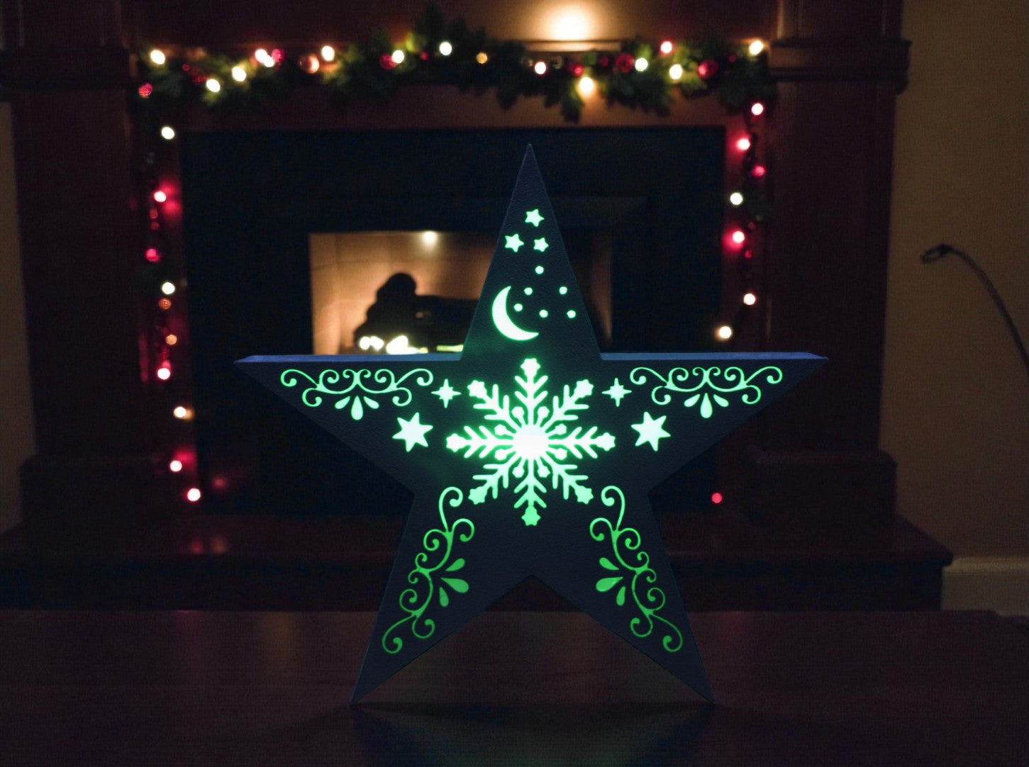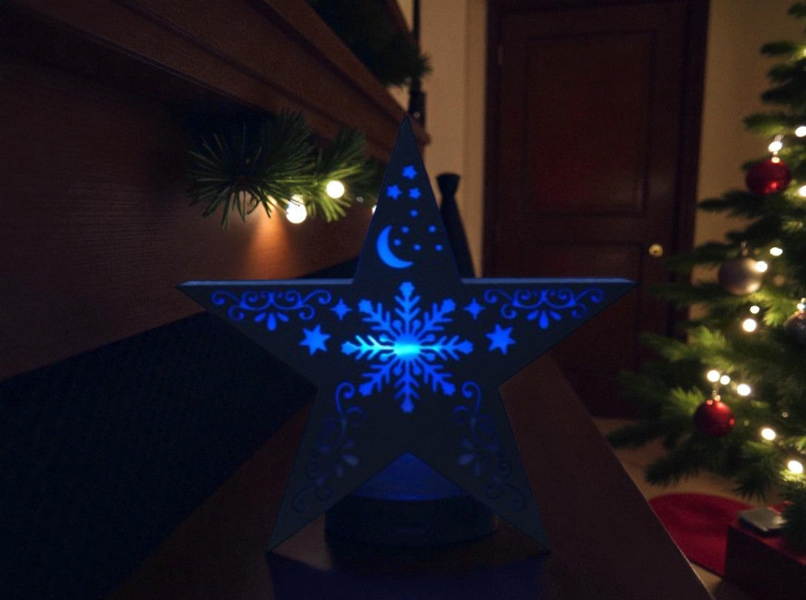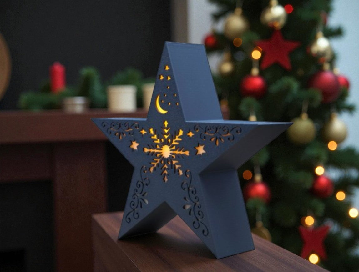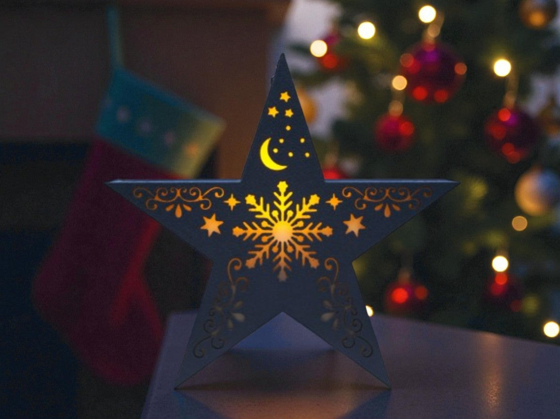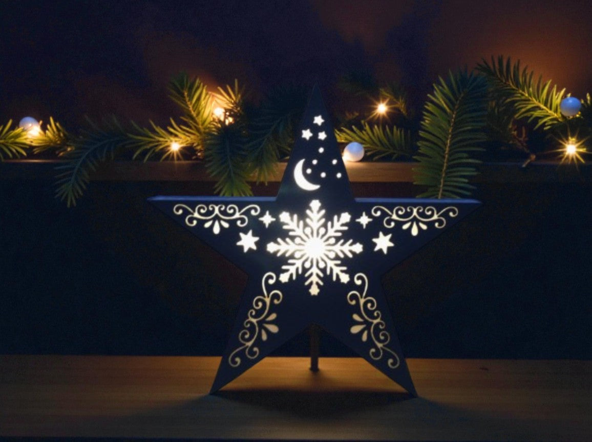 Φέρε τη μαγεία των Χριστουγέννων στον χώρο σου με αυτό το εντυπωσιακό χριστουγεννιάτικο κηροπήγιο σε σχήμα αστεριού, διακοσμημένο με λεπτομέρειες που φωτίζονται απαλά μέσα από τα κοψίματα: νιφάδες, φεγγάρι και μικρά αστέρια δημιουργούν μια γιορτινή, παραμυθένια ατμόσφαιρα.
